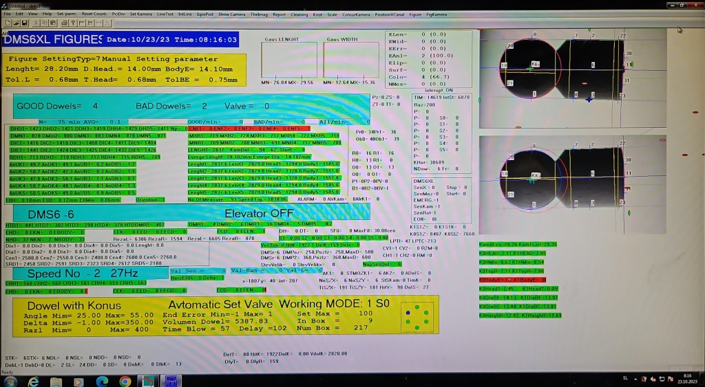 DMS6 XL system does not have a pre-sorting system, because both color control cameras are inside a measuring this way inspection of the surface of the dowel is performed simultaneously with the measurement. The system assembles pictures of entire surface of the dowel from multiple images and detects color defects over the entire surface. We added to DMS6 XL automatically adjustment of V-channel height and the sorting table with a mirror. This function allows control of wider and longer dowels.